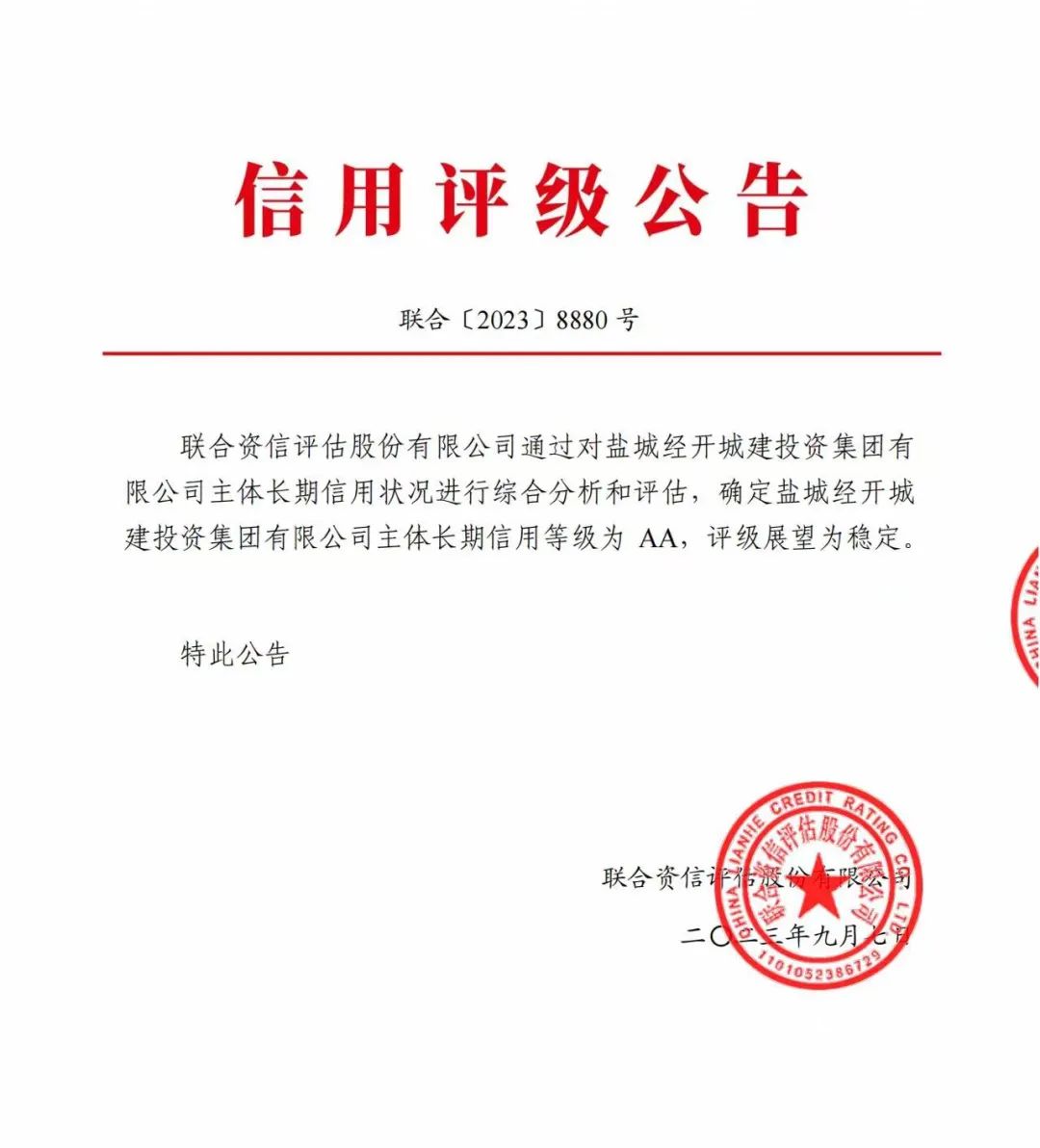 9月7日,經(jīng)國(guó)內(nèi)權(quán)威評(píng)級(jí)機(jī)構(gòu)聯(lián)合資信評(píng)估股份有限公司(簡(jiǎn)稱(chēng)“聯(lián)合資信”)綜合分析評(píng)定,鹽城經(jīng)開(kāi)城投集團(tuán)成功獲評(píng)AA主體信用評(píng)級(jí),評(píng)級(jí)展望為“穩(wěn)定”。