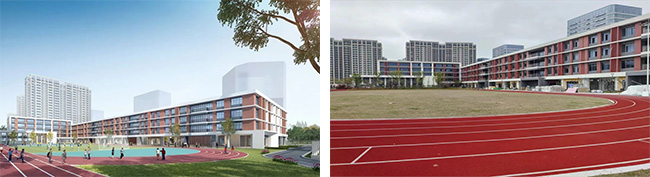 科技城小學(xué)內(nèi)裝項(xiàng)目效果圖(左)與現(xiàn)場(chǎng)圖(右)