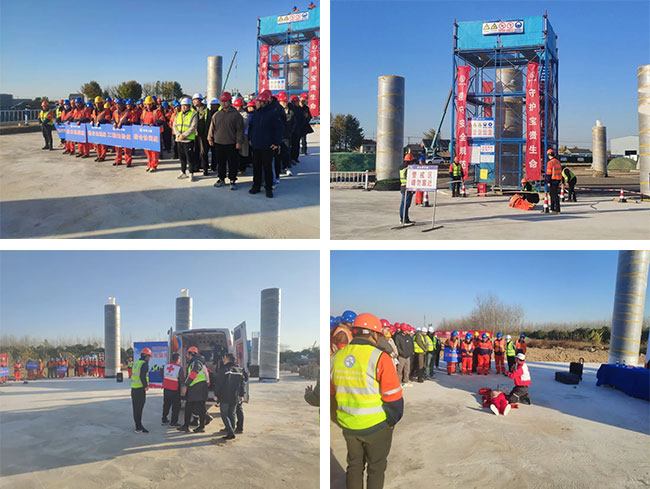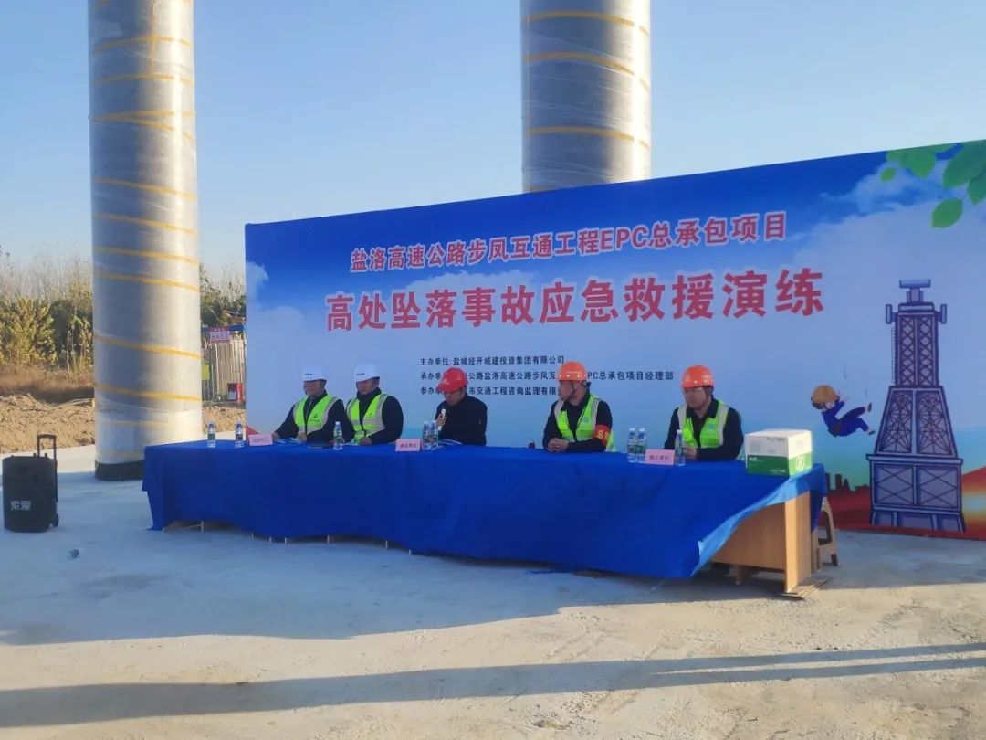 為持續(xù)樹(shù)牢安全紅線意識(shí),普及安全生產(chǎn)知識(shí),提升施工現(xiàn)場(chǎng)管理和一線作業(yè)人員安全素養(yǎng)和防護(hù)意識(shí),有效保障施工領(lǐng)域安全生產(chǎn)形勢(shì)平穩(wěn),11月28日下午,鹽城經(jīng)開(kāi)城投集團(tuán)在鹽洛高速步鳳互通項(xiàng)目現(xiàn)場(chǎng)開(kāi)展高處墜落事故應(yīng)急救援演練活動(dòng)。集團(tuán)工程條線全體人員及各在建項(xiàng)目項(xiàng)目經(jīng)理、總監(jiān)參加活動(dòng)。