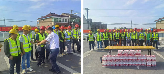 項目現(xiàn)場,張志軍詳細(xì)了解了項目作息時間、現(xiàn)場防暑降溫物資配備、高溫作業(yè)防護(hù)和安全生產(chǎn)措施等情況,并為每位施工人員分發(fā)了豐富的“清涼禮包”,包括礦泉水、藿香正氣水、人丹等一系列防暑降溫物品,承載著對工人健康與安全的深切關(guān)懷。他強(qiáng)調(diào),當(dāng)下正值高溫酷暑時期,各項目部要統(tǒng)籌做好各項安全生產(chǎn)工作,重點(diǎn)抓好高溫天氣的防暑降溫、安全防護(hù)措施和應(yīng)急處置等工作,合理安排作業(yè)時間,切實(shí)維護(hù)施工人員的職業(yè)安全和健康。